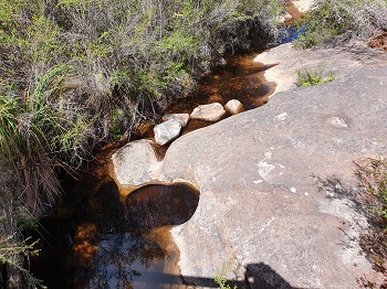 歩き始めてすぐにタンニン色に染まった小川を渡ります。