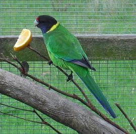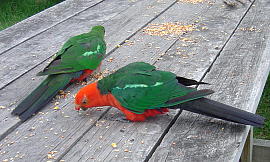 AUSTRALIAN KING PARROT 和名:キンショウジョウインコ 学名:Alisterus scapularis 英名:Australian King-Parrot 綱: 鳥網 目: オウム目 科: オウム科 頭胴長/体重:41-44cm 体色:オス-頭部から胴体にかけて明るい赤色で、羽は緑 メス-頭部と羽は緑色で、胴体の下辺りが、赤色 生息域:オーストラリア東部の雨林・ユーカリの森林地帯・海岸近くの森林地帯の背丈の高い木の穴に生息。 繁殖時期は、9月から1月で、3-5つの白い卵を産む。果実や種子、花の蜜などを餌としています。 |