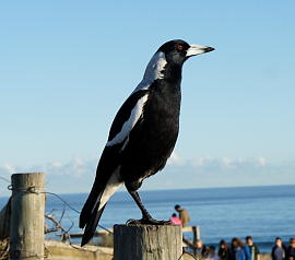 AUSTRALIAN MAGPIE 和名:カササギフエガラス 英名:Australian Magpie 科名:Gymnorhina tibicen 綱: 鳥綱 Aves 目: スズメ目 Passeriformes 科: モリツバメ科 Artamidae 属: Gymnorhina 種: tibicen 体長:34-44cm 体色:黒色に白の斑模様 生息地:オーストラリア全土 鳴声が非常に綺麗で、オルガンパイプのような音を出します。特に朝方に鳴きます。また他の鳥の鳴声も真似できます。カラス科に入るカラスのファミリーです。4-24匹でグループを形成し、テリトリーを作ります。このテリトリーを守るための攻防も激しいです。8月から10月が繁殖時期で、巣を守る親の攻撃性もこの時期は一段と強くなります。巣に近くづくものは、人間であろうと関係なく鋭いクチバシで襲ってきます。 |