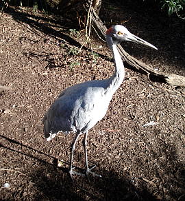 BROLGA 英名:Brolga (又はAustralian crane) 学名:Grus rubicundus 和名:ゴウシュウヅル(オーストラリアヅル) 目:ツル目 科:ツル科 体長:70cm-130cm 体色:シルバーグレー色、頭部の耳の回りが赤色の帯がある(子供には赤色の帯はない) 生息地:オーストラリア北部、東部(内陸部も含む) 群れで生活し、数百匹から時には数千匹にも及ぶ時がある。繁殖時期は、7月から3月で、湿地地帯に巣を作る。一夫一婦で、夫婦で交互に卵を温め、約11ヶ月で子育てが終わる。オーストラリアの北部が乾季になると、湿地の水が干上がるので、大群で、水が一年中豊富なKakado, Cape York, Atherton Tablelandにある湿地地帯に移動する。お互いに会うときに変わったダンスをする鳥でも知られる。クィーンズランド州の州の鳥でもある。 |