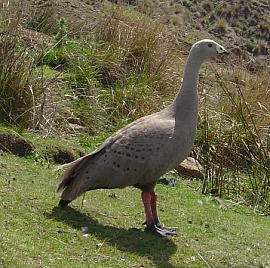 CAPE BARREN GOOSE 英名:Cape Barren Goose 学名:Cereopsis novaehollandiae 和名:ロウバシガン 目:カモ目 科:カモ科 体長:75-90cm(羽を広げた大きさ:150-190 cm ) 体重:平均5.29 kg (メス 3.77 kg) 体色:灰色とグレーが混ざった色、クチバシの上部が黄色に近い緑色 生息地:オーストラリア南東部、タスマニア付近の主に孤島のオープンな草原地帯(夏には食べ物を求めて本土の農場に移動する場合もある) 主にtussockやspear grassと呼ばれる草を主食とする。繁殖時期となる6月から9月にかけて、夫婦でオープンな草原地帯に巣を作り、テリトリーも作る。この時期には、テリトリーに進入してくる他の鳥達に攻撃的にテリトリーを守る。3-5個の卵を産み、約1ヶ月で雛が孵る。1950年代には、絶滅の危機だったが、現在は生態数は順調に増えている。 【写真撮影】2005年10月28日、タスマニア州マリア島 |