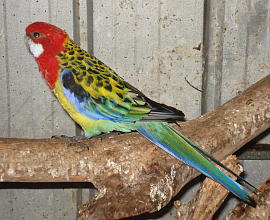 EASTERAN ROSELLA 英名:Eastern Rosella (又はWhite-cheeked Rosella、Red headed Rosella) 学名:Platycercus eximius 和名:ナナクサインコ 目:オウム目 科:オウム科 体長:29-34cm 体色:頭部から胸部にかけて赤色、クチバシ下辺りに白いのパッチ、背中は黄色に黒の斑点があり、羽は青色 生息地:オーストラリア南東部、タスマニア州 広い草原が近くにある森林地帯、農場等に生息する。 レインボーカラーの綺麗な色のインコです。Rosellaは、オーストラリアで、最も身近なインコです。8月から2月が繁殖時期で、木の穴の中の巣に4-7個の白い卵を産む。名前の由来は、初期の移民が、シドニーの郊外、Rose Hillでこのナナクサインコを良く見かけたので、Rose Hillerと呼ばれ、それが最終的にRosellaとなった。 |