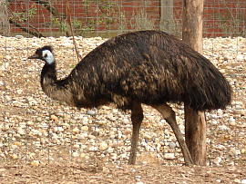 EMU 和名:エミュー 学名:Emu 英名:Dromaius novaehollandiae 綱: 鳥綱 目: ダチョウ目 科:ヒクイドリ科 頭胴長/体重: 体長1.5-2m(メスはオスよりやや大きい) 体色: 生息域: オーストラリア全域に生息する 体長1.5-2m(メスはオスよりやや大きい)になるオーストラリアで最も大きい走鳥類。この原始的な走鳥類には、ダチョー、ヒクイドリ、キーウィーが含まれる。Emuという語源は、ポルトガル語の"Ema"という言葉からきており、"大きい鳥"という意味。飛べない鳥のため、外敵に襲われるとジグザグに走って逃げるか(時速50kmをマークできる)、足で攻撃する場合もあります。繁殖時期は、5-6月で濃い緑色の卵を5-20個産みます。ここからオスが8-10週間かけて卵を温めて、ヒナを孵します。この間、オスはほとんど動かないためかなりの体重を減らすことになります。雛が孵っても、子供達は最高2年くらいオスと一緒に生活します。 |