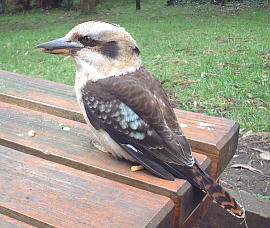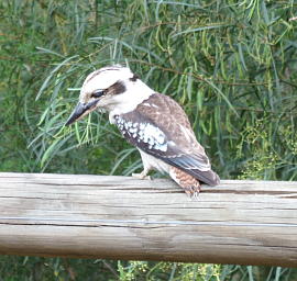 LAUGHING KOOKABURRA 和名:ワライカワセミ 学名:Dacelo novaeguineae 英名:Laughing Kookaburra 綱: 鳥綱 目: ブッポウソウ 科 カワセミ科 頭胴長 / 体長41-47cm 体色:頭部と腹は白いが、目の後ろに黒褐色の斑点がある 生息域:オーストラリア東部 笑うように鳴くため、Laughing Kookaburraと呼ばれている。この笑い声に似たさえずりは縄張りを示すものである。体長41-47cm、鋭く長く大きい口ばしを持ち、カワセミの種の中では一番大きい。オーストラリアの南西部、東部の森林に生息している。肉食で、昆虫・小さい爬虫類・ネズミ等の小さい哺乳類を餌としています。2000年シドニーオリンピックのマスコットでもありました。 【写真撮影】2009年10月5日グランピアンズ国立公園 |