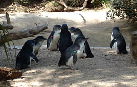 LITTLE PENGUIN 和名:コガタペンギン 英名:Little Penguin(別名:Fairy Penguin) 科名:Eudyptula minor 綱: 鳥綱 Aves 目: ペンギン目 科: ペンギン科 属: Eudyptula 種: minor 体長:40cm 体重:1kg 体色:ブルーグレーと白のツートンカラー 生息地:オーストラリア南部の海岸近く(タスマニア州も含む, ビクトリア州のフィリップ島が有名) 18種いるペンギンの中で一番小さい種類。他のペンギンとは違い、海岸近くの茂みに小さな穴を掘って、巣を作る。この巣は、子育てだけのもので、子が育つと、親も子も南氷洋に帰って行く。巣のかたまりの大きさは、1-2組のペンギンから、15,000組までとサイズがまちまち。8月から9月に2つの卵を産み、オスとメスで交互に卵を35日間温め、ヒナを孵す。ほとんどのペンギンが、オスとメスだけで2匹の子供に十分な餌を与えてやることができあす、1匹しか子供が育たない。 |