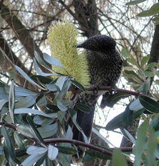 LITTLE WATTLEBIRD 英名:Little Wattlebird (又はBrush Wattlebird) 学名:Anthochaera lunulata 和名:ギンホミツスイ 目:スズメ目 科:ミツスイ科 体長:26-31cm 体色:銀色の縞模様 生息地:オーストラリア南東部&南西部・タスマニア州 バンクシア&ユーカリの森林地帯・潅木エリアなどに生息し、6月から12月に繁殖時期となり、1-2個のピンク色の卵を産む。ミツスイ科の他の鳥達と同じく、ちょこまかと動きながらバンクシアの蜜等を吸っていく。 |
