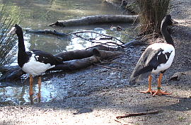 MAGPIE GOOSE 英名:Magpie Goose 学名:Anseranas semipalmata 和名:カササギガン 目:カモ目 科:カササギガン科 体長: 生息地:オーストラリア北部、ニューギニア *南東部に生息していたカササギガンは絶滅 主に湿地帯・沼地等に生息する水鳥で、マコモなどの草を食べる。オス1匹、メス2匹(稀に3匹のメス)が1組の家族として繁殖活動を行う。5-14個の卵を産み、水面に葦で編んだ巣を作る。垂直に伸びた長い首、フックのようなクチバシは、泥の下にある根っこや球根を食べる為に発達したと言われる。 |