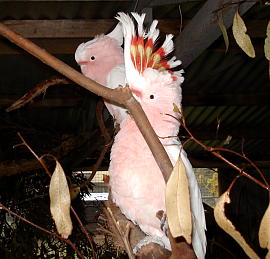 MAJOR MITCHELL`S COCKATOO 英名:Major Mitchell`s Cockatoo(又は Pink Cockatoo) 学名:Cacatua leadbeateri 和名:クルマサカオウム 目:オウム目 科:オウム科 体長:35-40cm 体色:クチバシが白色、頭部から胴体にかけて淡いピンク色、トサカは白に赤と黄色の縞模様 生息地:オーストラリアの乾燥した内陸部 写真を撮ろうとしたので、威嚇するためにトサカを見せていました、オウム種の中でも最も綺麗なクルマサカオウムです。 トサカを立てると見事な色合いが見られ、オウムの中でもとても綺麗な種類。つがいで、数千匹の群れで餌をもとめて移動する。餌は地面から採取できるいろいろな植物の種。南部では8月から12月が繁殖時期(北部では4月から6月)で、2-4個の白い卵を産む。絶滅の危機の恐れはないが、他のオウム種(Galah, Sulphur-crested cockatoo)より生息数は少ない。また他のオウム種より警戒心が強く、人間にはなかなか近寄らせない。名前の由来は、このオウムを見つけた本人でもある冒険家のSir Thomas Mitchellからきている。 |