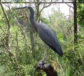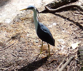 PIED HERON 英名:Pied Heron 学名:Ardea picata 和名:ムナジロクロサギ 目:コウノトリ目 科:サギ科 属:シラサギ属 体長:43-50cm 体色:クチバシと足が黄色、喉元から胸にかけて白色、背中から尾にかけてダークグレー(子供は、頭部は全体が白色で、トサカがない) 生息地:オーストラリア北部の海岸近くの水場がある所 2月から3月にかけて繁殖時期を迎え、3-4個の青緑色の卵を産む。水生の昆虫、カエル(甲殻類と小さい魚)が主食。冬にはさらに北のインドネシアまで移動する場合がある。 |