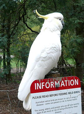 SULPHUR-CRESTED COCKATOO 和名:キバタン 学名:Cacatua galerita 英名:Sulphur-crested Cockatoo 綱: 鳥網 目: オウム目 科: オウム科 頭胴長/体重:41-51cm 体色:白色、頭部後にあるトサカの様なものが黄色 生息域:オーストラリア内陸部を除いた北部、東部、南西部、タスマニア州 オーストラリアでも最も広く分布し、生態数も多いオウムの種類。 野生は集団で動き、時には数百匹を超える時がある。8月から1月にかけて繁殖し、2-3個の卵を産む。雌雄交替で30日間卵を暖め、ヒナは6~9週間で巣立ちます。 【写真撮影】2008年6月21日 ダンデノン国立公園 |
