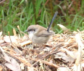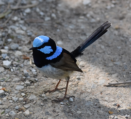 SUPERB FAIRY-WREN 英名:Superb Fairy-wren 学名:Malurus cyaneus 和名:ルリオーストラリアムシクイ 目:スズメ目 Passeriformes 科:オーストラリアムシクイ科 体長:全長13-14cm、体色:メス-頭部・背中が茶色、腹部が白色 オス-黒色の頭部と胸部に鮮やかな青色のマークが頭の真上、目の下、背中にある(写真上はオス)。 生息地:オーストラリア南東部 6月から2月にかけて繁殖時期を迎える。繁殖時期には、オスは花びら(特に黄色)をちぎってメスに見せる習性がある。ドーム型の巣を作り、3-4個のピンクがかった白色の卵を産む。縦に伸びている尾は、主にバランスを取るためのもの。主食は小さな虫で、副食として種・果実類をとる。 |