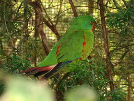 SWIFT PARROT 英名:Swift Parrot 学名:Lathamus discolor 和名:オトメインコ 目:オウム目 科:オウム科 体長:23-26cm、目は黄色で、クチバシの上下と尾が赤色 生息地:オーストラリア南東部、タスマニア島 英語名の名前の通り、インコ類で一番早く飛べる鳥。生息地のユーカリの森が減少しているため、絶滅の危機にさらされている。繁殖のためバス海峡を渡り、タスマニア島に移動する。6-20mの高さにある木の幹にある穴を巣として使う。3-5個の白色の卵を産む。 |