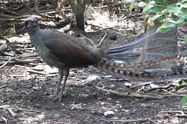 Superb Lyrebird 英名:Superb Lyrebird 学名:Menura novaehollandiae 和名: コトドリ 目: スズメ目 科: コトドリ科 体長:全長:80-100 cm 羽の長さ:60 cm 背面は灰色、腹面は乳白色、翼およびのどが赤茶色。オスはレースのような尾羽を持ち、 それが竪琴に似ているために和名の由来となっている(lyreはギリシャ語で竪琴という意味)。 オーストラリアの10セント硬貨に描かれている鳥。地上で、腐葉土や腐った木の枝を脚で後ろにかき出しながら、地中の昆虫やミミズなどの無脊椎動物を探しだし捕食する。 繁殖期になると雄は、1mほどの塚を落ち葉や枯れ木などをかき集めて作り、その上でディスプレイを行う。 ディスプレイは飾り羽のついた尾羽を上に持ち上げ、飾り羽を自分の体の上に覆うようにし、他の鳥類の鳴き声をまねながらダンスをする。 個体によっては、カメラのシャッター音、チェーンソーの音、車のブレーキ音など人工的な音を真似することが知られている。 雌は1羽で巣を作り、一回の産卵で1つの卵を産み、子育てを行う。 【写真撮影】 2011年10月27日、ビクトリア州、ヒールスビル鳥獣保護区 |