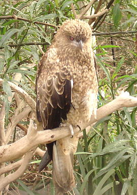 WHISTLING KITE 英名:Whistling Kite(又はWhistling Eagle) 学名:Haliastur sphenurus 和名:フエフキトビ 目:コウノトリ目 科:タカ科 体長:全長50-60cm、翼開長120cm 生息地:オーストラリア全土 口笛を吹く(Whistling)ように鳴くので、Whistling Kiteと呼ばれている。主に水場に近い森林地帯に生息する。猛禽類で、ウサギの子供や魚を主食とする。6月から10月に繁殖時期をむかえ(2月から3月、オーストラリア南部)、2-3個の卵を産む。 |