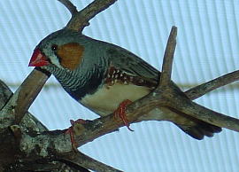 ZEBRA FINCH 英名:Zebra Finch 学名:Taeniopygia guttata 和名:キンカチョウ(錦華鳥・錦花鳥) 目:スズメ目 科:スズメ科 体長:10cm 体色:赤いクチバシ、オレンジ色のパッチが目の真下にある(オスのみ)、頭部から背中にかけてグレー色、尾は黒色に白色の斑 生息地:オーストラリア全土(北部のYork Penninsula、タスマニア州除く)の比較的乾燥した地域 群れを作って移動し、地面に落ちている草木の種を主食とする。10月から4月が、繁殖時期となるが、場所(降雨量)によって変わる。ドームのような巣の中で、4-5個の薄い青色の卵を産む。 |