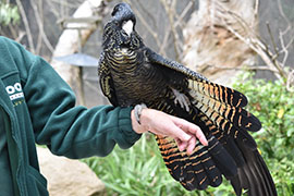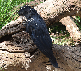 RED-TAILED BLACK COCKATOO 英名:Red-tailed Black-Cockatoo 学名:Calyptorhynchus banksii 和名:アカオクロオウム 目:オウム目 科:オウム科 体長:50-64cm 体色:オス(写真上)-体色、クチバシ共に黒色、尾の裏側が赤色 メス(写真下)-全体的に黒色だが、クチバシは白く、黄色い斑点が頭部から尾にかけて広がる 生息地:オーストラリア北部と西部 数百から数千匹の群れで移動する。地面に落ちている木の葉、実等を主食とする。7月から10月(北部は4月から7月)に繁殖時期をむかえ、1個白い卵産む。巣は通常高木の高い所にある穴を利用する。場所によっては絶滅の危機となっている。ブラックマーケットで最も人気のあるオウム種で、特にはUS$20,000以上の値段で取引される場合がある。この写真は、メスのアカオオウムです。 |
